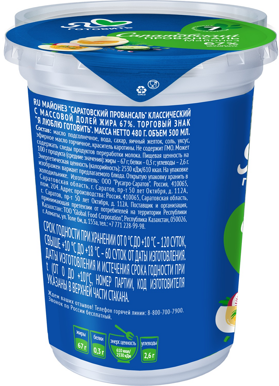 Майонез Я люблю готовить Саратовский провансаль 67%, 500мл