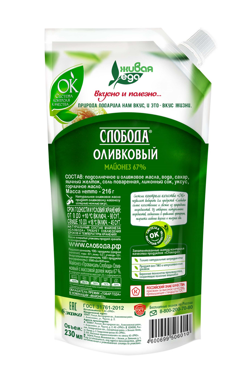 Слобода Оливковый — классический майонез с добавлением масла испанских оливок. В состав майонеза входят только натуральные ингредиенты: свежие яичные желтки, отборные масла, уксус и специи. Майонез Оливковый обладает нежной кремовой текстурой и насыщенным вкусом. Он прекрасно подходит для заправки салатов, гармонирует с мясом и рыбой, а также является идеальной основой для маринадов. Попробуйте натуральный майонез Слобода и сделайте любимые блюда еще вкуснее! Слобода — бренд, который знают и любят многие россияне уже на протяжении 30 лет. Все продукты Слобода отличаются настоящим вкусом и неизменным высоким качеством. Они не просто соответствуют ГОСТу, а обладают настоящей силой природы и производятся с заботой о будущем!