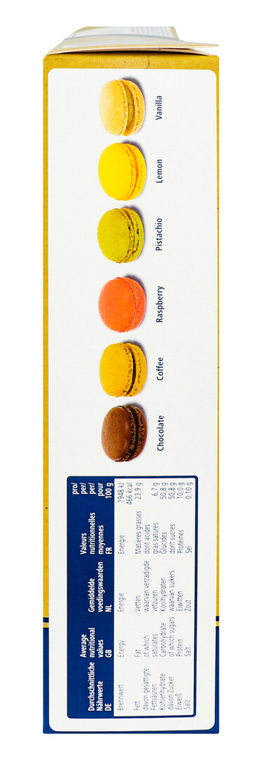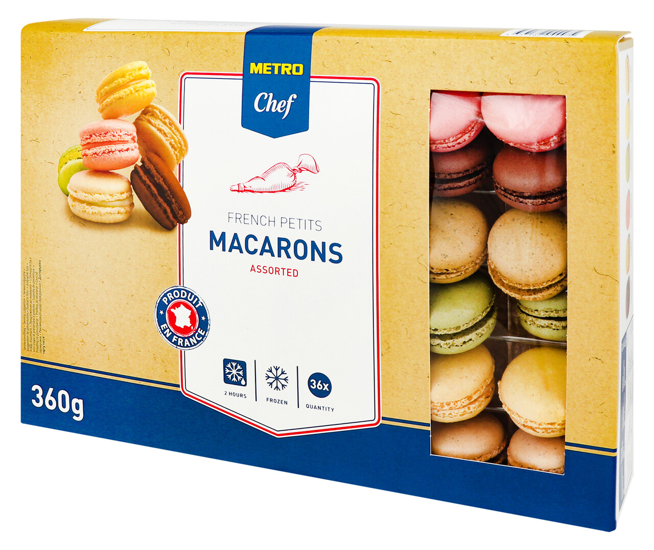METRO Chef Макарони замороженные (10г x 36шт), 360г представляют из себя микс из 6 видов десерта: кофейный, шоколадный, лимонный, малиновый, фисташковый, ванильный. Диаметр 38 мм. 35% изделия составляет начинка. Коробка состоит из трех отделений по 12 макарон в каждом. Способ приготовления: 1. Достать макаруны из упаковки и выложить на тарелку. 2. Дать оттаять в холодильнике (0-4C) в течении 1 часа, затем 1 час при комнатной температуре. 3. После разморозки хранить под пищевой пленкой не более 5 дней при температуре от 0C до +4C.
