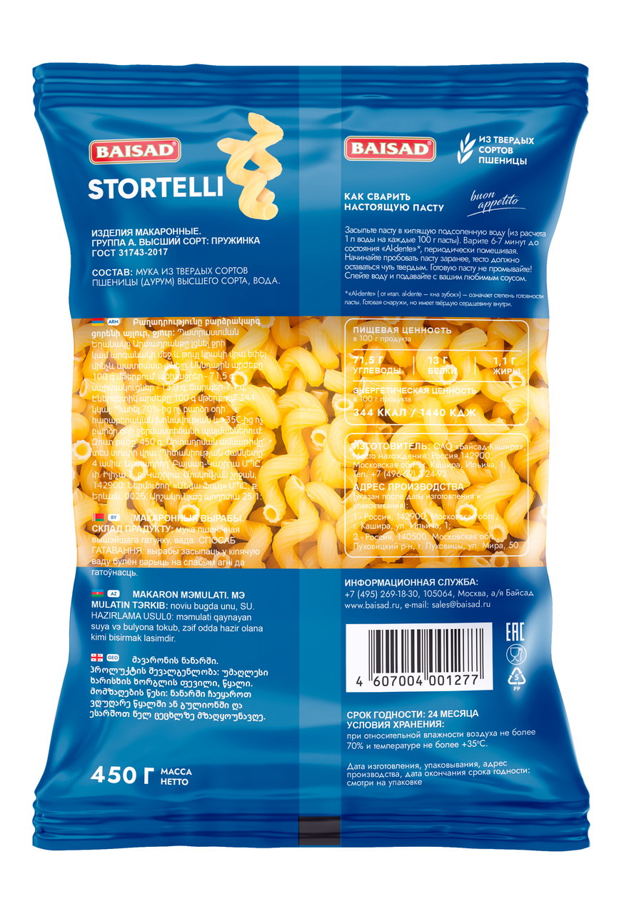Макароны пружинки Baisad Stortelli высший сорт ГОСТ, 450г