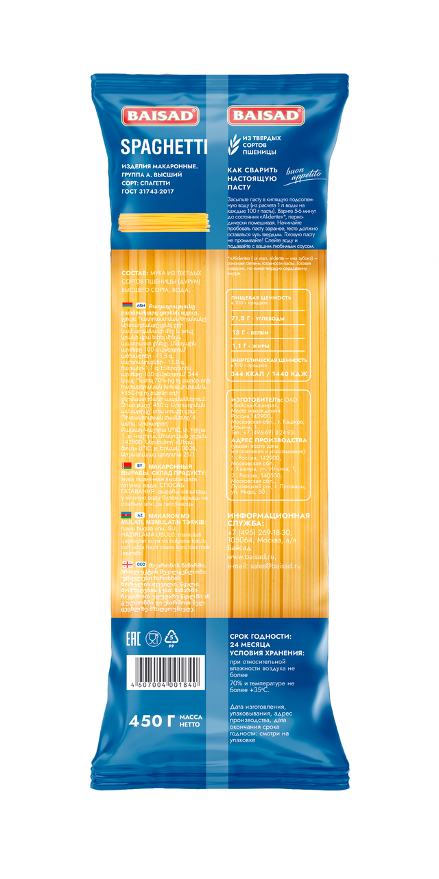 Макароны спагетти Baisad Spaghetti высший сорт ГОСТ, 450г