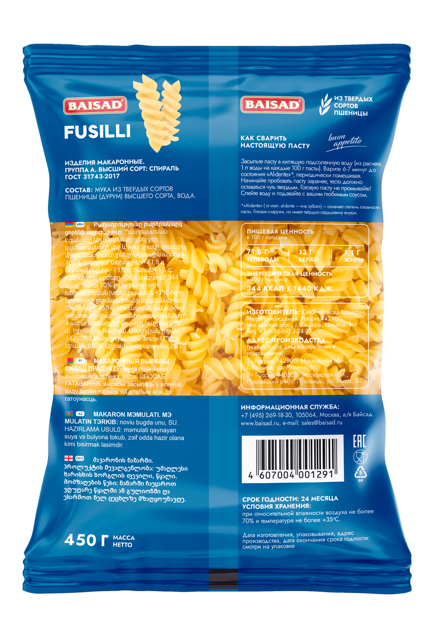 Макароны спирали Baisad Fusilli высший сорт ГОСТ, 450г