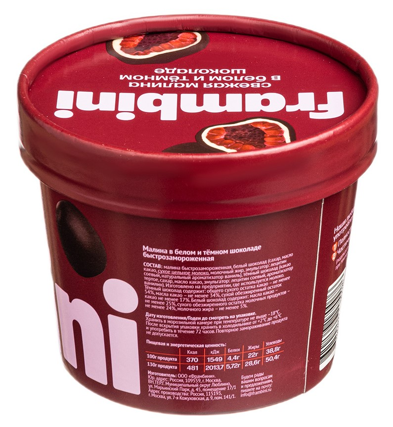 Малина быстрозамороженная, белый шоколад сахар, масло какао, сухое цельное молоко, молочный жир, эмульгатор: лецитин соевый, натуральный ароматизатор ваниль, тёмный шоколад какао тёртое, сахар, масло какао, эмульгатор: лецитин соевый, ароматизатор ванилин.
