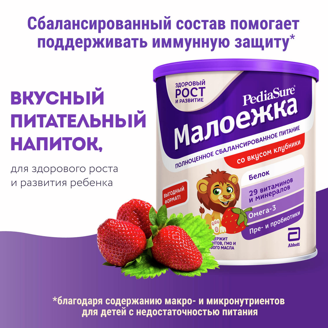 PediaSure Малоежка со вкусом клубники - это вкусный питательный напиток, который дополнит несбалансированную еду питательными веществами, чтобы ребёнок получал всё самое необходимое для здорового роста, развития и укрепления иммунитета. Предназначен для питания детей от 1 года до 10 лет, подходит для ежедневного употребления. В одной банке 400 г содержится 8 порций. В одной порции 225 мл содержится 29 важнейших витаминов и минералов (включая витамины D, A и C), 6. 7 г белка, кальций, йод, железо, Омега-3, 6 жирные кислоты, про- и пребиотики. Сбалансированный помогает ребенку не только расти и развиваться, но и поддерживать иммунную защиту, благодаря содержанию макро- и микронутриентов. PediaSure Малоежка 400 г. Помогает восполнить питательные вещества, которые ребенок не получил вместе с едой. Не содержит искусственных красителей, консервантов, ГМО, пальмового масла и глютена. Имеет клинически доказанную эффективность.