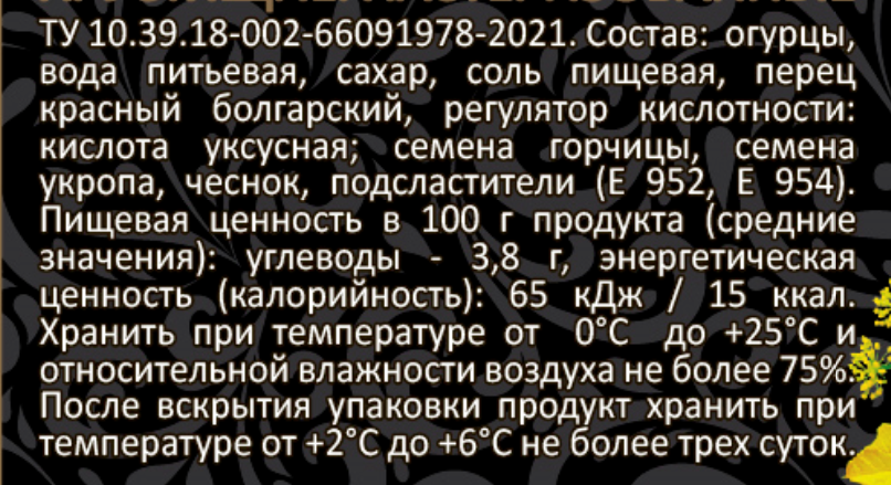 Огурцы, вода питьевая, сахар, соль, регулятор кислотности: уксусная кислота, семена горчицы, другие специи и пряности.