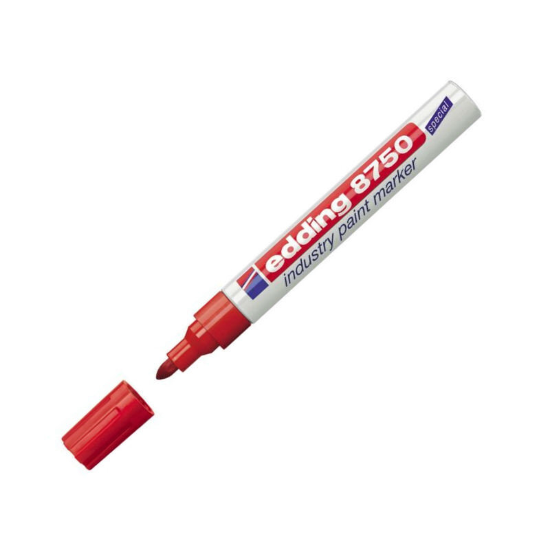 Маркер Edding промышленный E-8750 красный, 2-4мм - промышленный лаковый маркер для промышленной, индустриальной графики, с пулевидным наконечником повышенной устойчивости к истиранию. Маркер универсален для нанесения маркировки и надписей в сложных, агрессивных промышленных условиях. Хорошо подходит для письма на грязных, жирных поверхностях. Выдерживает воздействие кислотами, растворителями, механическому воздействию. Стойкие чернила, ложатся густым плотным слоем с лаковым эффектом на гладкие и пористые поверхности. Надписи хорошо видно издалека на темных поверхностях. Специально разработанный состав маркера Edding 8750 растворяют масляную пленку на поверхности письма. Температурный режим краски маркера 1000 C. Максимальная температура поверх��ости при написании маркером не более 100 градусов по Цельсию. Толщина линии 2–4 мм. Размеры маркера: диаметр 15 мм, длина 141 мм.