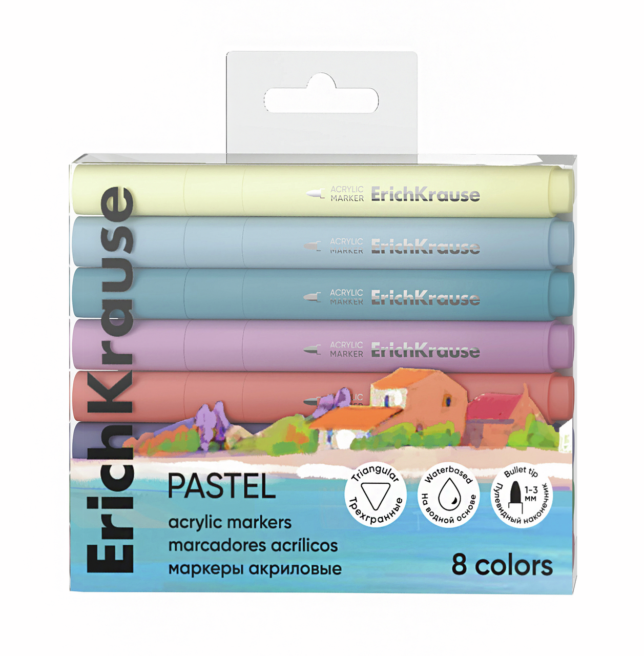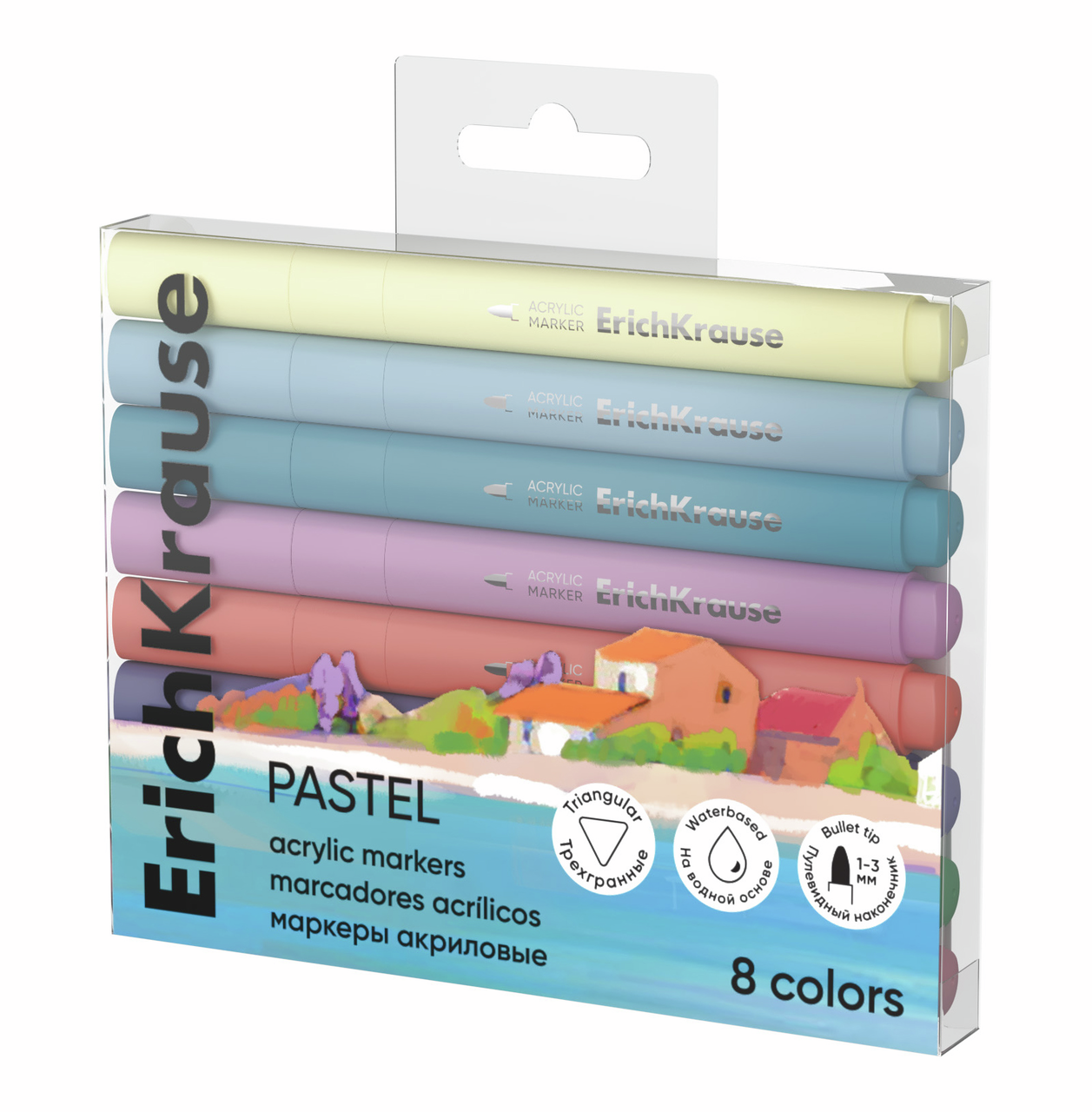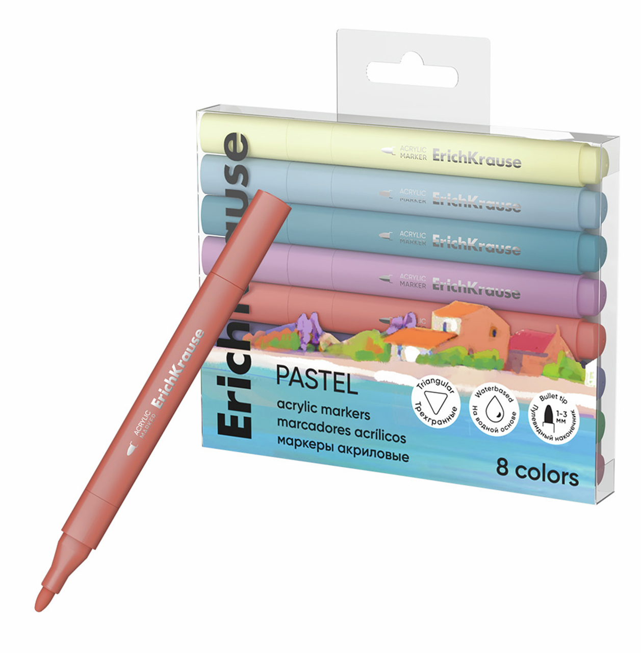 Акриловые маркеры на водной основе с пулевидным наконечником. В наборе представлены трендовые пастельные цвета. Подходят для всех типов поверхностей: стекло, керамика, холст, бумага, пластик, дерево, камень. Идеальны для скетчинга и декорирования.