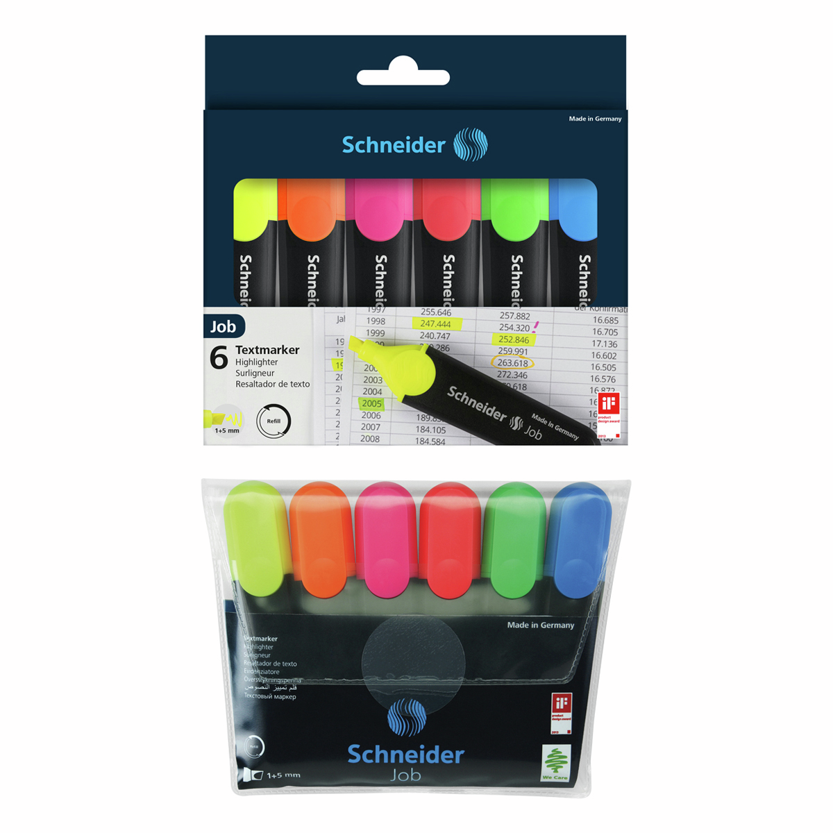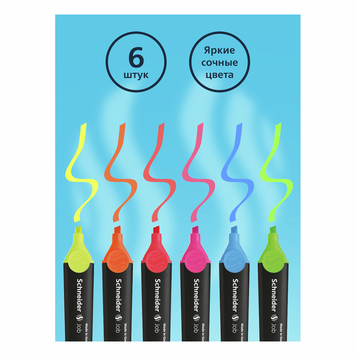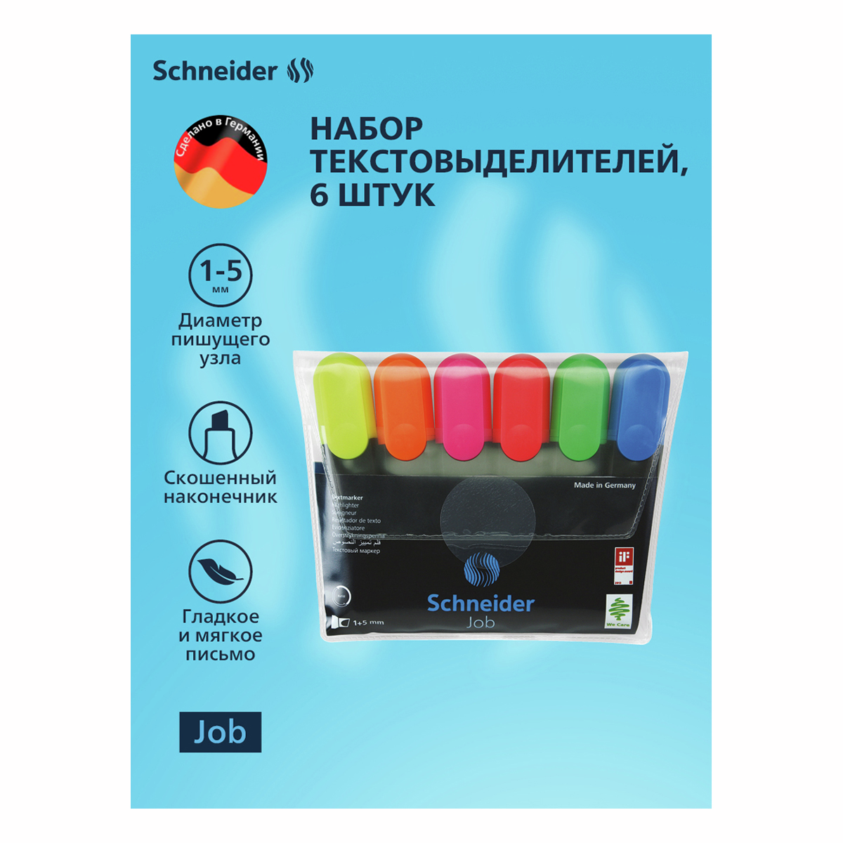 Маркеры текстовые Schneider Job, 6 цветов предназначены для подчеркивания и выделения важных мест в печатном или рукописном тексте, а также создания крупных схематических изображений. В состав комплекта входят текстовые маркеры ярких неоновых цветов: голубого, зеленого, желтого, розового, красного и оранжевого. Благодаря плоской форме корпуса аксессуары удобно держать в руке. Скошенный наконечник позволяет рисовать как тонкие, так и толстые линии шириной от 1 до 5 мм. Маркеры оставляют яркие, устойчивые к выгоранию следы на бумаге любого типа: обычной, предназначенной для факсов и ксероксов.