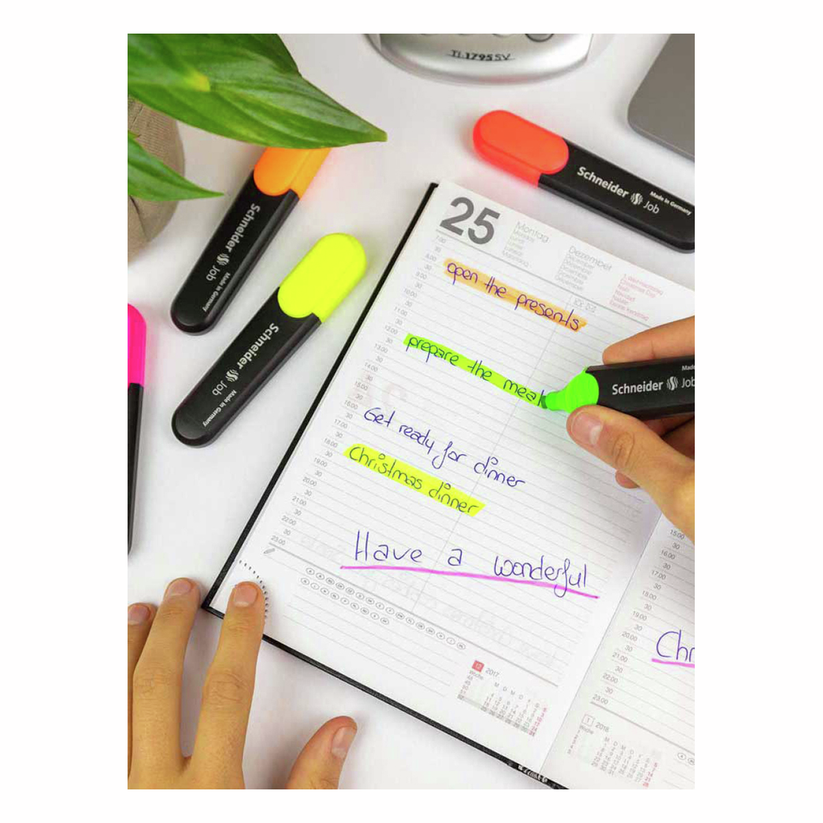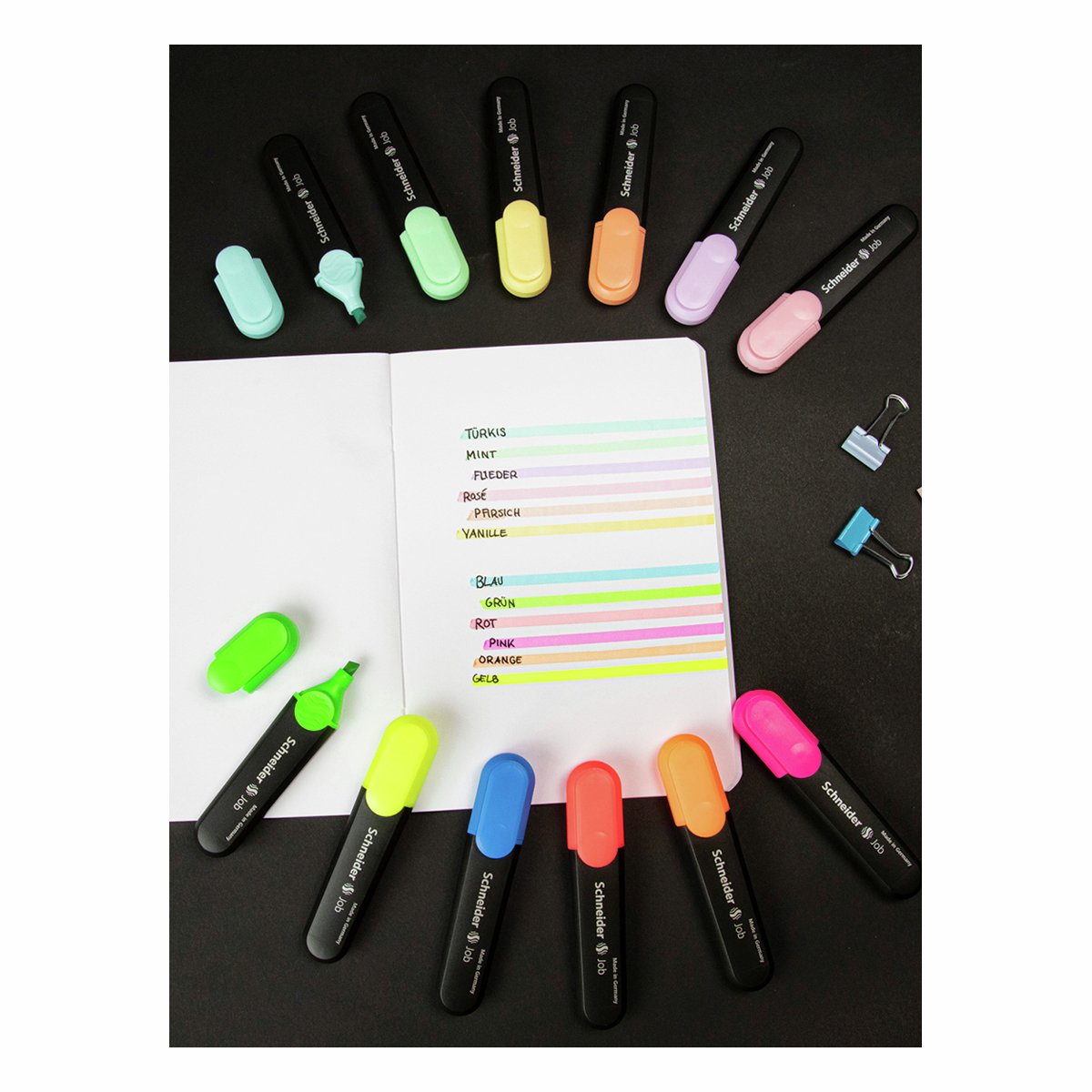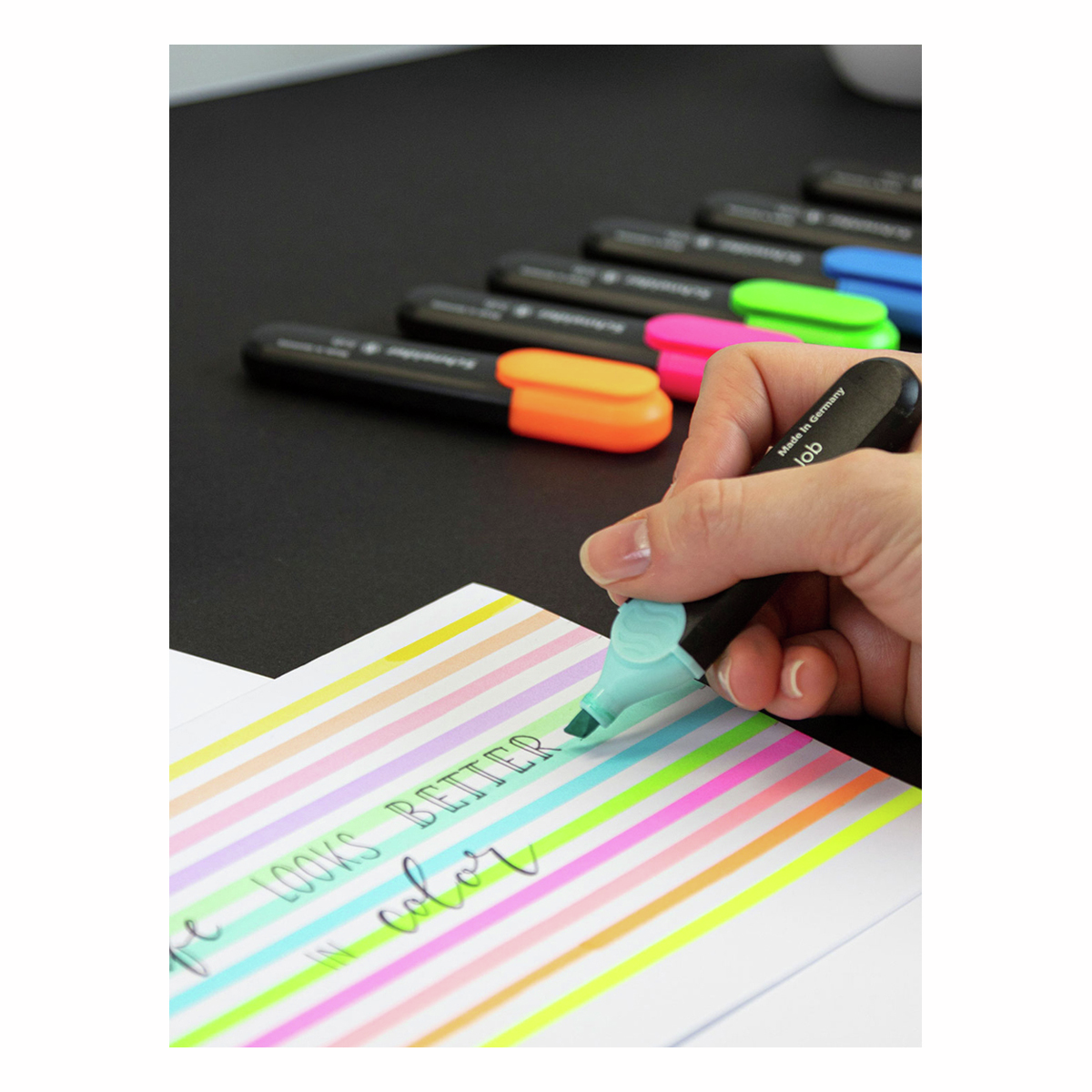 Маркеры текстовые Schneider Job, 6 цветов предназначены для подчеркивания и выделения важных мест в печатном или рукописном тексте, а также создания крупных схематических изображений. В состав комплекта входят текстовые маркеры ярких неоновых цветов: голубого, зеленого, желтого, розового, красного и оранжевого. Благодаря плоской форме корпуса аксессуары удобно держать в руке. Скошенный наконечник позволяет рисовать как тонкие, так и толстые линии шириной от 1 до 5 мм. Маркеры оставляют яркие, устойчивые к выгоранию следы на бумаге любого типа: обычной, предназначенной для факсов и ксероксов.