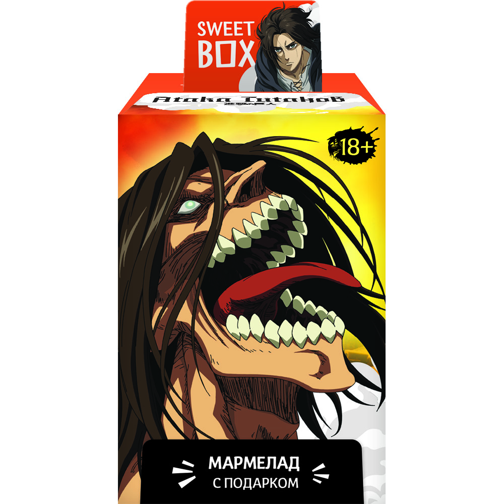 Коллекция Sweet Box Атака Титанов. В каждой коробочке вкусный мармелад с натуральным фруктовым соком подарок: игрушка. Коробочка с большой коллекционной игрушкой в виде любимого персонажа или другим приятным подарком (браслетом, брелоком, значком, пуллером), а также вкусная сладость - мармелад с натуральным соком. Яркая коробочка с любимым персонажем и вкусной сладостью обязательно понравится ребёнку и его родителям.