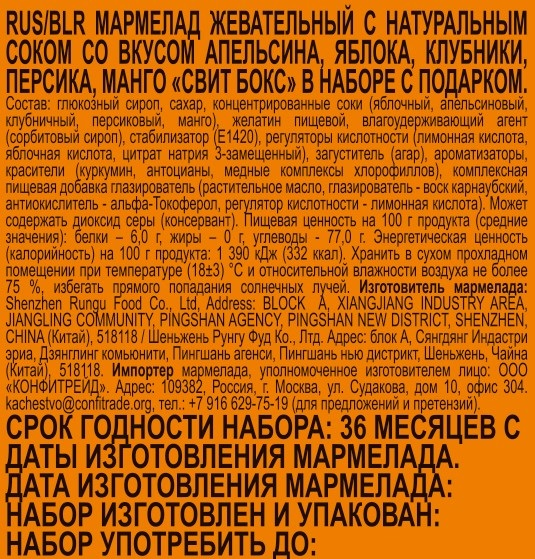 Глюкозный сироп, сахар, концентрированные соки (яблочный, апельсиновый, клубничный, персиковый, манго), желатин пищевой, влагоудерживающий агент (сорбитовый сироп), стабилизатор (Е1420), регуляторы кислотности (лимонная кислота, яблочная кислота, E331), загуститель (агар), ароматизаторы, красители (куркумин, антоцианы, E141), комплексная пищевая добавка глазирователь (растительное масло, глазирователь - воск карнаубский, антиокислитель - альфа-токоферол, регулятор кислотности - лимонная кислота).