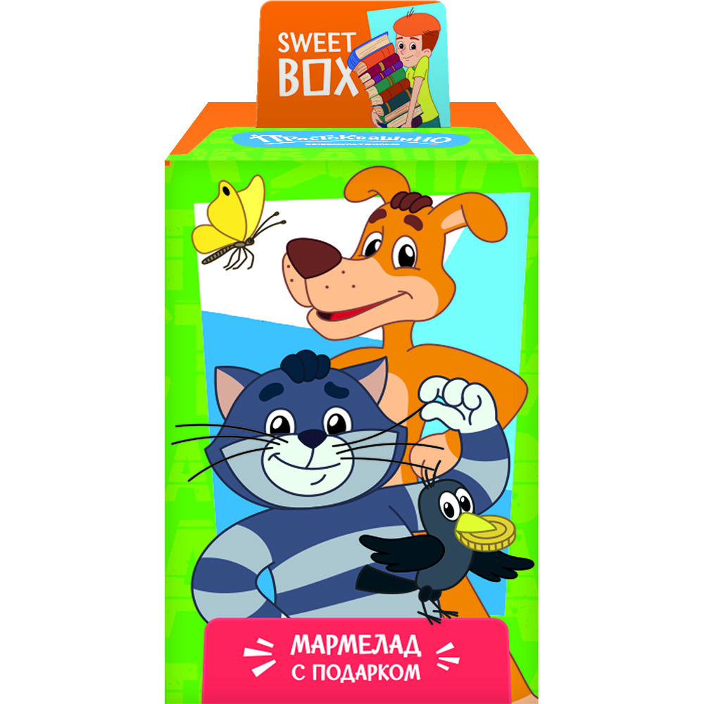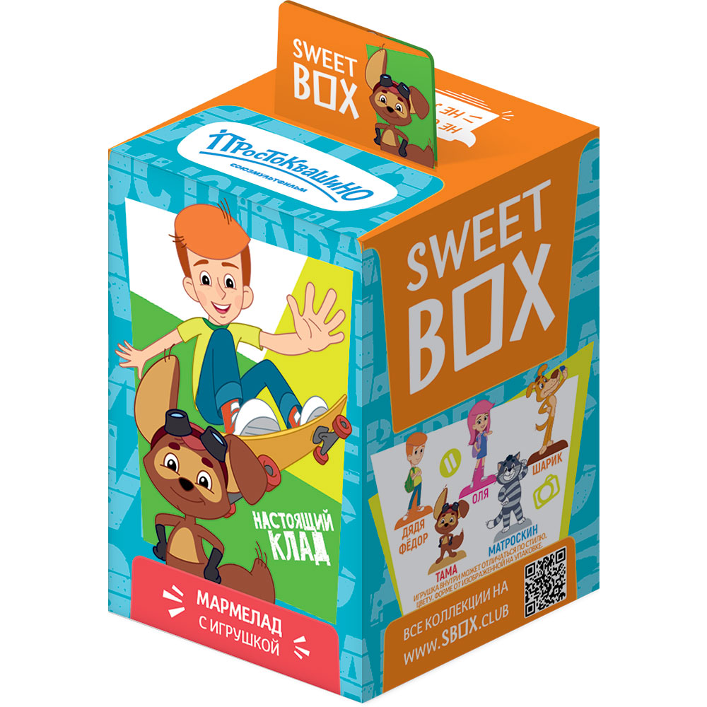 Коллекция Sweet Box Простоквашино. В каждой коробочке вкусный мармелад с натуральным фруктовым соком подарок: игрушка, значок. Коробочка с большой коллекционной игрушкой в виде любимого персонажа или другим приятным подарком (браслетом, брелоком, значком, пуллером), а также вкусная сладость - мармелад с натуральным соком. Яркая коробочка с любимым персонажем и вкусной сладостью обязательно понравится ребёнку и его родителям.