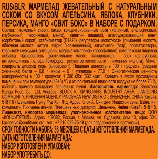 Глюкозный сироп, сахар, концентрированные соки (яблочный, апельсиновый, клубничный, персиковый, манго), желатин пищевой, влагоудерживающий агент (сорбитовый сироп), стабилизатор Е1420, регуляторы кислотности – лимонная кислота, яблочная кислота, цитрат натрия 3-замещенный, загуститель – агар, ароматизаторы, красители (куркумин, антоцианы, медные комплексы хлорофиллов), комплексная пищевая добавка глазирователь (растительное масло, глазирователь – воск карнаубский, антиокислитель – альфа-токоферол, регулятор кислотности – лимонная кислота).