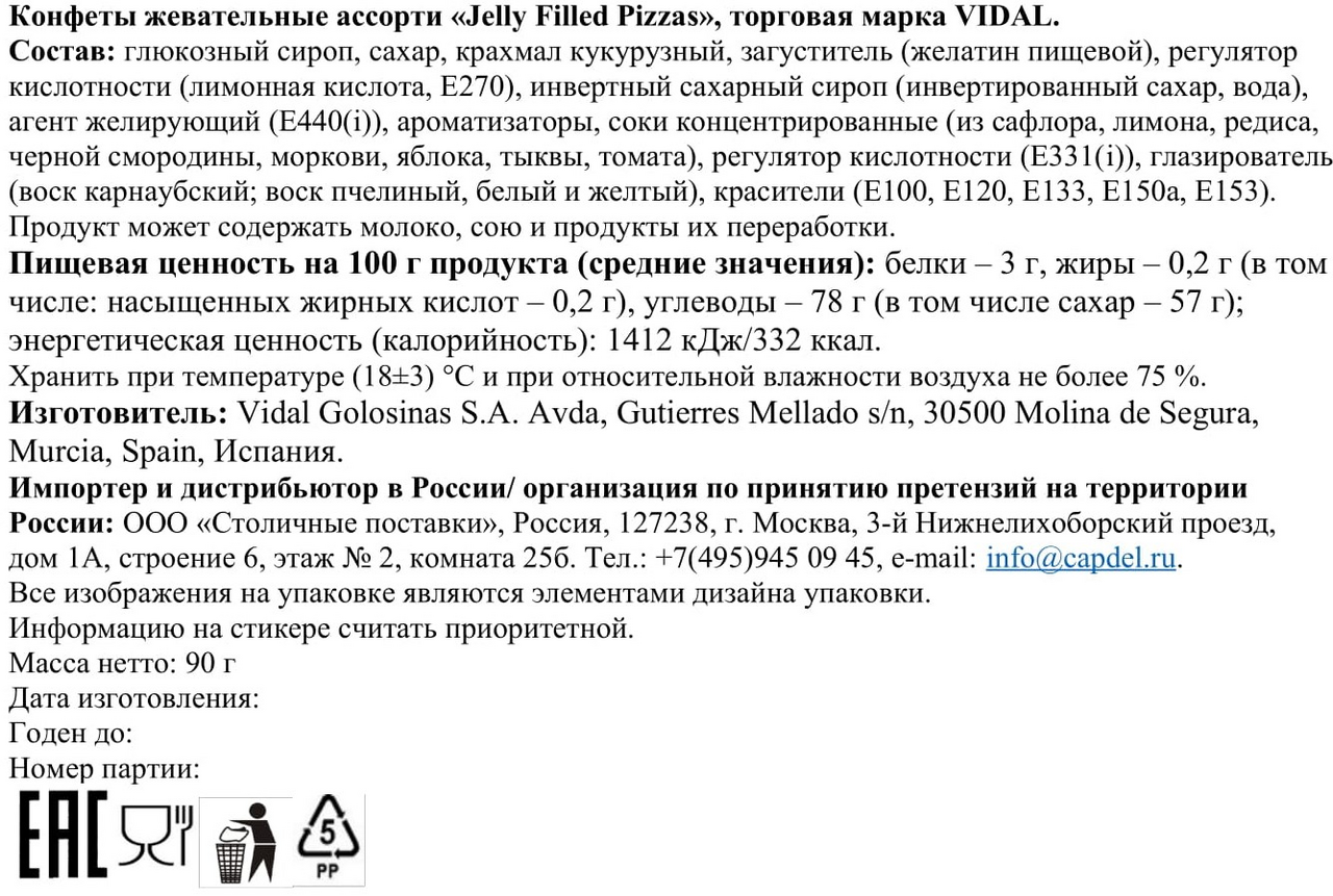 Сироп глюкозы, сахар, кукурузный крахмал, желатин; кислоты: лимонная кислота, молочная кислота; инвертированный сахарный сироп; загуститель: пектин; специи и пряности; концентраты фруктов и овощей: сафлор, лимон, редька, тыква, яблоко, томат, черная смородина, морковь; регулятор кислотности: цитрат натрия; растительные жиры, желирующие агенты: карнаубский воск, пчелиный воск, красители: E100, E120, E133, E150a, E153, E171.