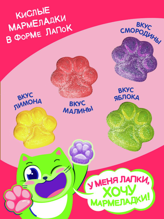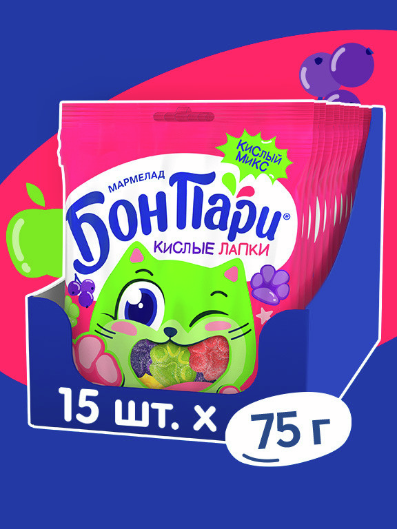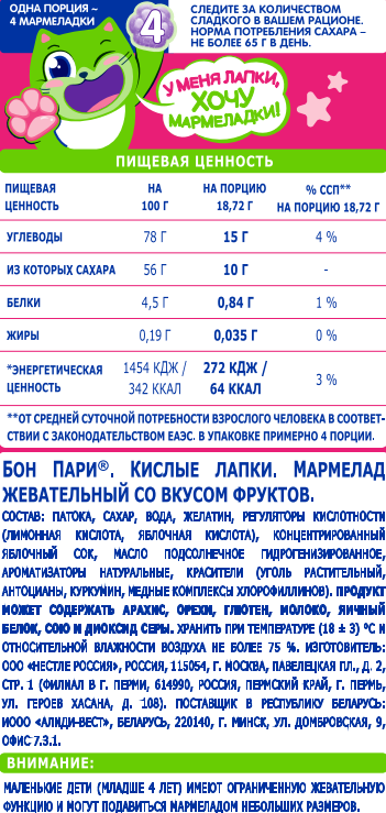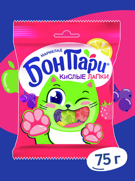 Кислые лапки - это кислый микс мармеладок со вкусами лимона, черной смородины, малины и яблока в трендовой форме кошачьих лапок. Каждая мармеладная лапка - это сочетание фруктового или ягодного вкуса и кислой обсыпки, которое приятно удивит юных и взрослых фанатов жевательных конфет. Яркую и удобную упаковку всегда можно взять с собой или разделить с близкими. Наслаждайтесь мармеладными лапками, но не забывайте о рекомендуемой порции сладкого - 4 мармеладки. Жевательный мармелад Бон Пари Кислые лапки не содержит искусственных красителей.