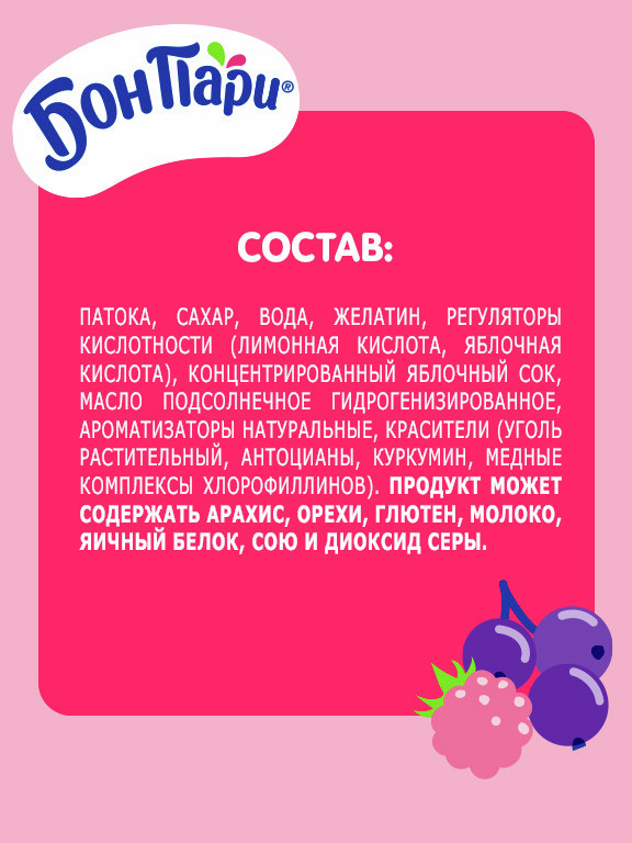 Патока, сахар, вода, желатин, регуляторы кислотности (лимонная кислота, яблочная кислота), концентрированный яблочный сок, масло подсолнечное гидрогенизированное, ароматизаторы натуральные, красители (уголь растительный, антоцианы, куркумин, медные комплексы хлорофиллинов).