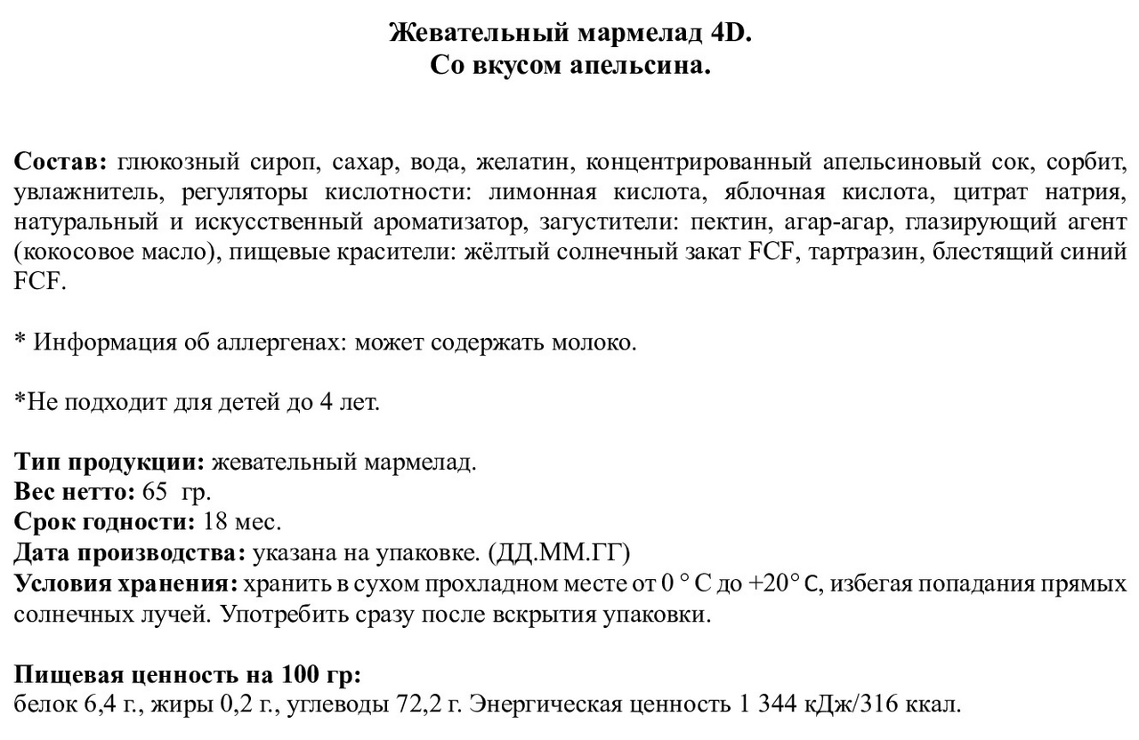 Глюкозный сироп, сахар, вода, желатин, концентрированный апельсиновый сок, увлажнитель, регуляторы кислотности: лимонная кислота, яблочная кислота, цитрат натрия, натуральный и искусственный ароматизатор, загустители: пектин, агар-агар, глазирующий агент кокосовое масло, пищевые красители: FD&C красный 40.