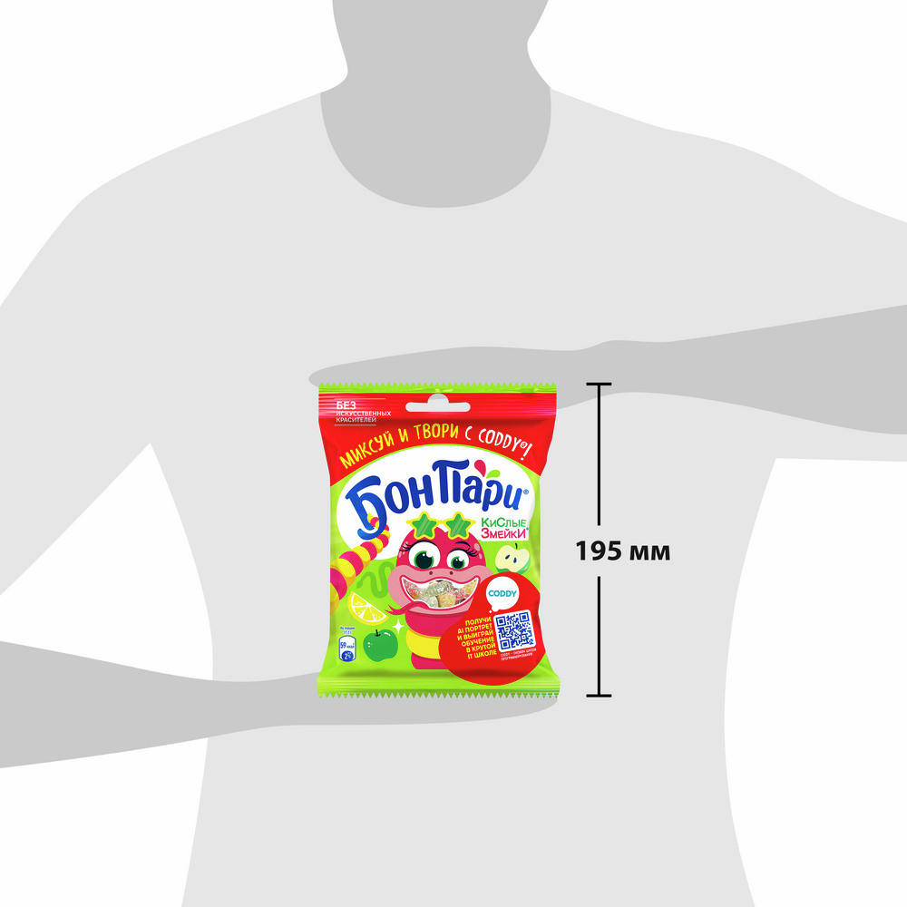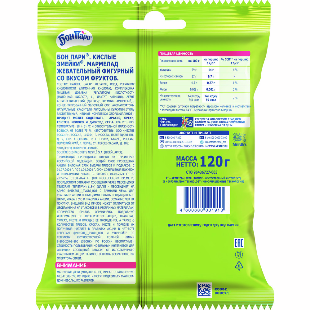 Жевательный мармелад Бон Пари в форме змеек в кислой посыпке от бренда номер 1.Мармелад Бон Пари для тех, в ком жив внутренний ребенок: экстра длинные многоцветные мармеладки в форме змеек с кисло-сладким вкусом ужасно привлекательны для юных и взрослых фанатов жевательных конфет. Побалуйте себя сочным фруктово-ягодным миксом со вкусом фруктов в сахарной обсыпке – яблоко-малина и лимон-черная смородина. Упаковкой удобно делиться с друзьями или для того, чтобы весело провести время с семьей. Следите за рекомендуемой порцией сладкого. Одна порция - 2 мармеладки. Мармелад производится без добавления искусственных красителей. В производстве используется концентрированный фруктовый сок. Кислый жевательный мармелад со вкусом фруктов в сахарной обсыпке - яблоко-малина и лимон-черная смородина в форме длинных забавных змеек. Необычное сочетание кислого и сладких вкусов. Без искусственных красителей.