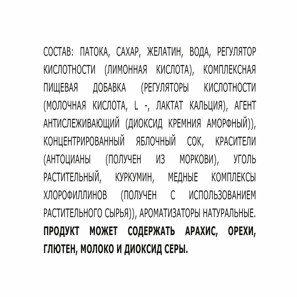 Патока, сахар, желатин, вода, регулятор кислотности (лимонная кислота), комплексная пищевая добавка (регуляторы кислотности (молочная кислота, L -, лактат кальция), агент антислеживающий (диоксид кремния аморфный)), концентрированный яблочный сок, красители (антоцианы (получен из моркови), уголь растительный, куркумин, медные комплексы хлорофиллинов (получен из растительного сырья)), ароматизаторы натуральные.