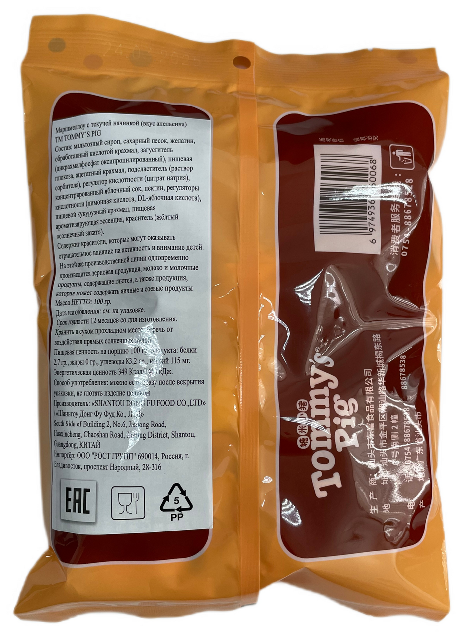 Маршмеллоу Tommy's Pig с начинкой апельсин, 100г