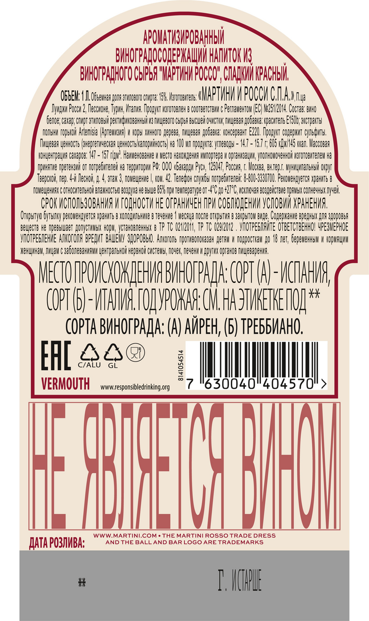 Напиток виноградосодержащий Martini Rosso из виноградного сырья красный сладкий, 1л