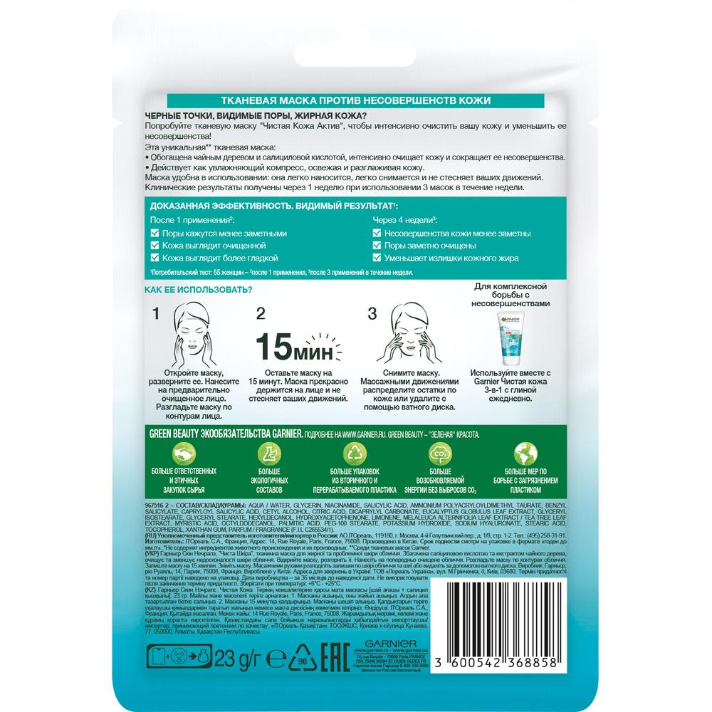 Попробуйте тканевую маску "Чистая Кожа Актив",чтобы интенсивно очистить вашу кожу и уменьшить ее несовершенства! Тканевая маска: Обогащена чайным деревом и салициловой кислотой,интенсивно очищает кожу и сокращает ее несовершенства. Действует как увлажняющий компресс,освежая и разглаживая кожу. Маска удобна в использовании: она легко наносится,легко снимается и не стесняет ваших движений. Клинические результаты получены через 1 неделю при использовании 3 масок в течение недели. Способ применения:1. Откройте маску, разверните ее. Нанесите на предварительно очищенное лицо. Разгладьте маску по контурам лица.2. Оставьте маску на 15 минут. Маска прекрасно держится на лице и не стесняет ваших движений.3. Снимите маску. Массажными движениями распределите остатки по коже или удалите с помощью ватного диска.4. Для комплексной борьбы с несовершенствами Используйте вместе с Garnier Чистая кожа 3-в-1 с глиной ежедневно.