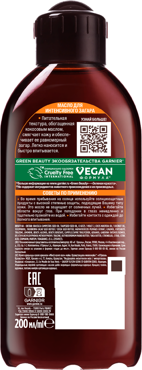 Garnier Ambre Solaire стремится предоставить вам надежную защиту от солнца c 1935 года. Так же обязуется заботиться о вашей коже с помощью масла для интенсивного загара. Оно питает и смягчает кожу, одновременно придаёт ей сияние, необычайную мягкость и по-летнему приятный кокосовый аромат. Подходит для тех, кто желает приобрести более интенсивный загар. Масло для интенсивного загара, популярное среди любителей солнца, создано на основе питательной формулы и очень удобно в использовании. Оно придает коже сияние, необычайную мягкость и по-летнему приятный кокосовый аромат. Подходит для тех, кто желает приобрести более интенсивный загар. Смягчает кожу, одновременно придает ей сияние, необычайную мягкость и по-летнему приятный кокосовый аромат. Подходит для тех, кто желает приобрести более интенсивный загар. Масло для интенсивного загара, популярное среди любителей солнца, создано на основе питательной формулы и очень удобно в использовании.