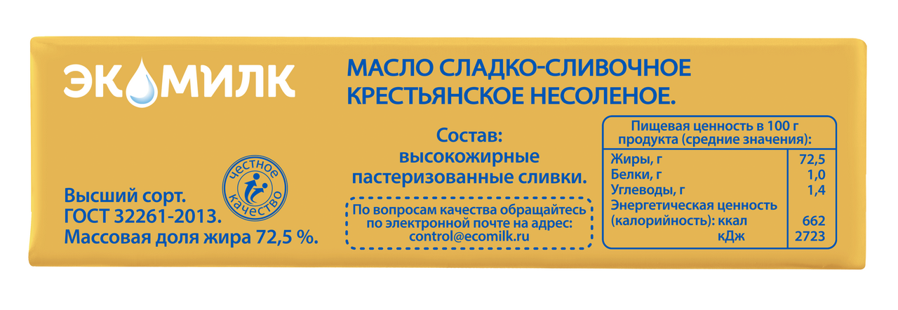 Масло Экомилк сладко-сливочное крестьянское 72.5%, 180г