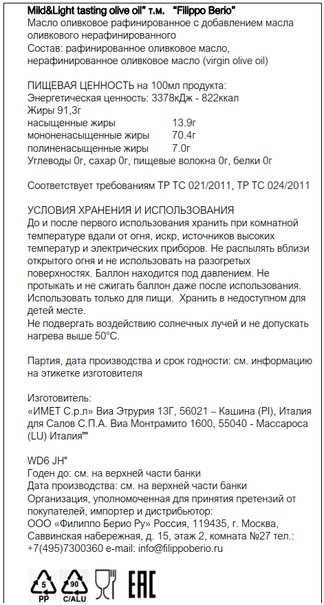 Оливковое рафинированное масло Filippo Berio Mild & Light в формате спрея специально разработано для аэрогрилей. Благодаря тонкому и равномерному распылению, вы можете идеально контролировать количество используемого масла для приготовления блюд, которые получаются хрустящими снаружи и тающими во рту - без избытка жира. Идеально подходит для аэрогрилей, плит, грилей и духовок.Меньше калорий и больше вкуса.100% натуральный продукт, без добавок и пропеллентов.Удобный формат для быстрого и аккуратного распыления.