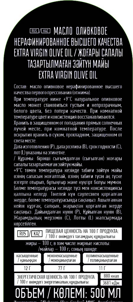 Насыщенный вкус, подходит для заправки салатов, употребления для поддержания здоровья а так же в косметических целях. Получено исключительно из оливок, обработанных механическим способом. Идеально подходит для салатов, готовых блюд из овощей, мяса, рыбы, а так же в качестве основы для соусов. Внимание! При температуре ниже 9C натуральное оливковое масло может становиться густым и не прозрачным, меняя естественный цвет на белый, не теряя при этом своих качеств.