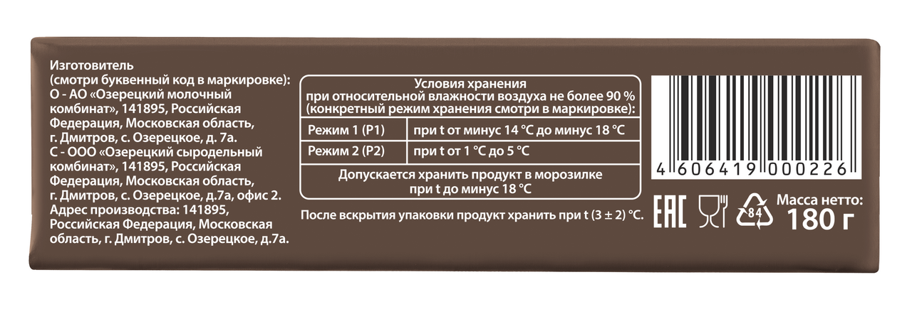 Масло шоколадное Экомилк 62%, 180 г – натуральный продукт отечественного производства. Озерецкий молочный комбинат славится тем, что использует в производстве высокожирные сливки, шоколадное масло не стало исключением. За счет натурального состава в продукте превалируют два вкусовых оттенка: яркий шоколадный и нежный сливочный. Продукт прекрасно подходит для создания простых бутербродов к завтраку, а также применяется в качестве ингредиента в более сложных блюдах. Обратите внимание на фольгированную упаковку, она прекрасно защищает масло от посторонних запахов и прямых солнечных лучей. К тому же дизайн, выполненный в минималистическом стиле, привлекает взгляд.