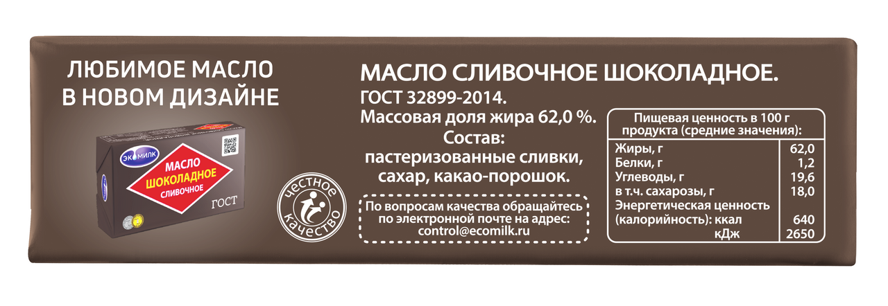 Масло сливочное Экомилк Шоколадное ГОСТ 62%, 180г