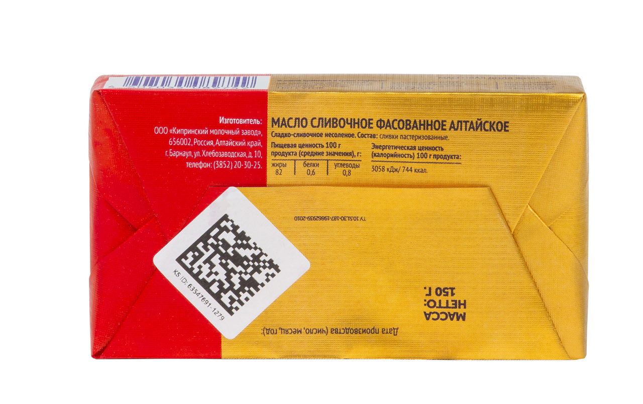 Сливочное масло Алтайское разработано кипринскими Мастерами специально для тех, кто выбирает только качественные и натуральные продукты. Изготавливается это масло из чистого молока и свежих сливок, благодаря чему имеет свой насыщенный сливочный вкус, равномерную плотную консистенцию и нежный молочный запах, а также содержит много витаминов и полезных веществ. Имеет насыщенный сливочный вкус с нотками томлености и ореховым послевкусием, обладает нежным молочным запахом. Производится только из высококачественных пастеризованных сливок без каких-либо добавок. Прекрасно подойдет для бутербродов, блинов, каш и выпечки.
