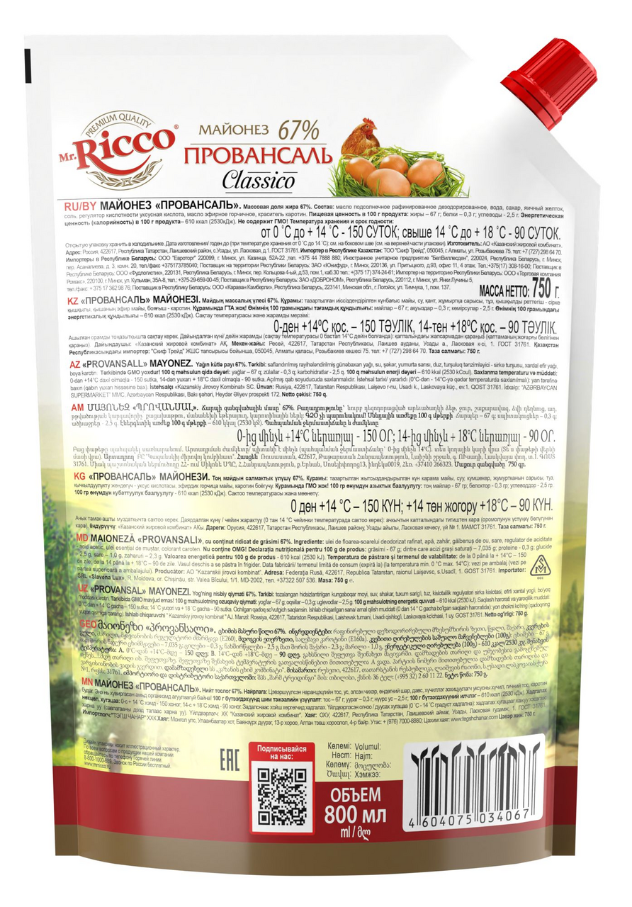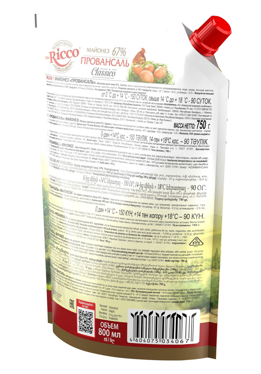 Майонез Mr. Ricco Classico Провансаль 67%, 800мл