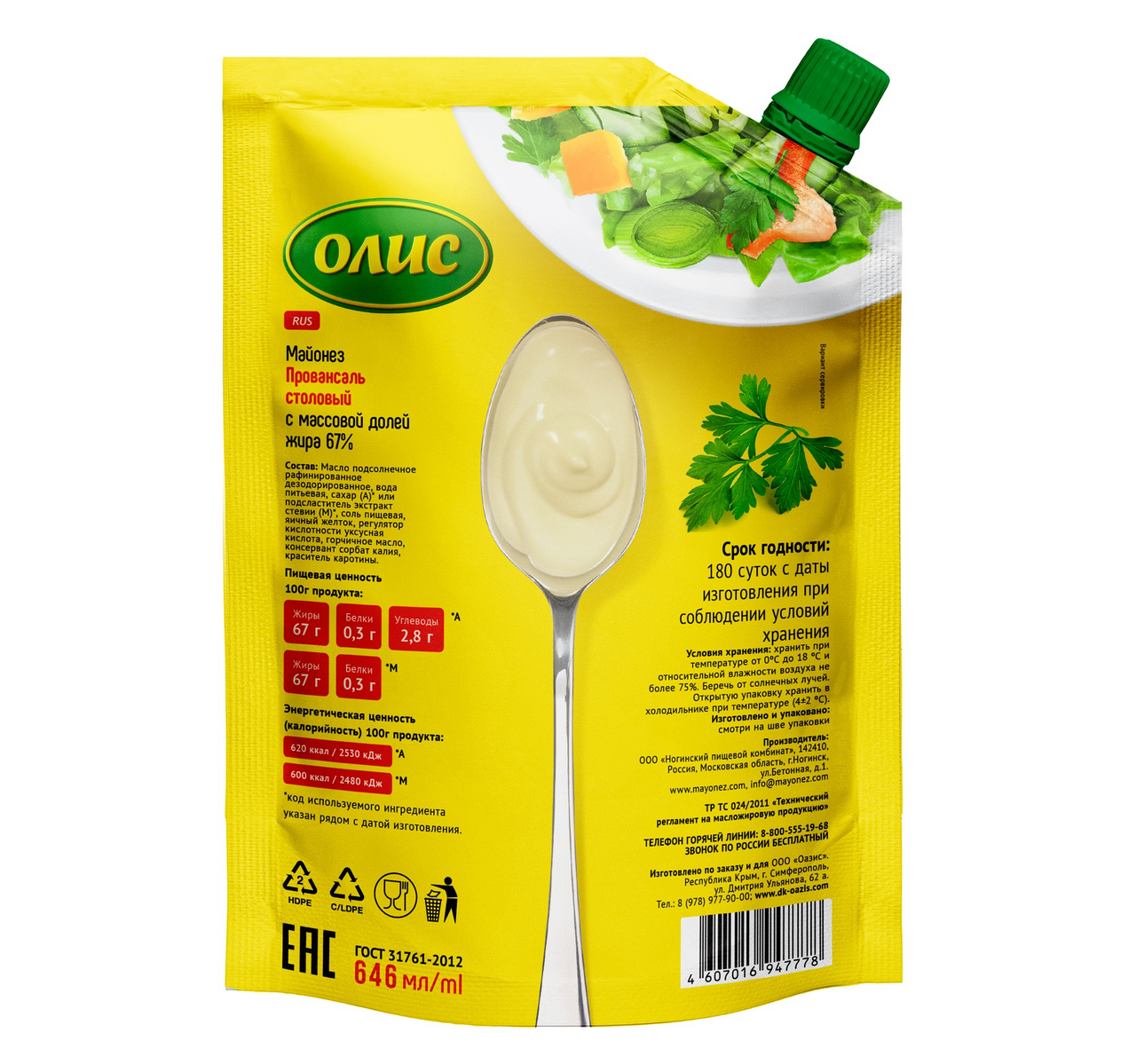 Майонез Олис Провансаль столовый 67%, 646мл
