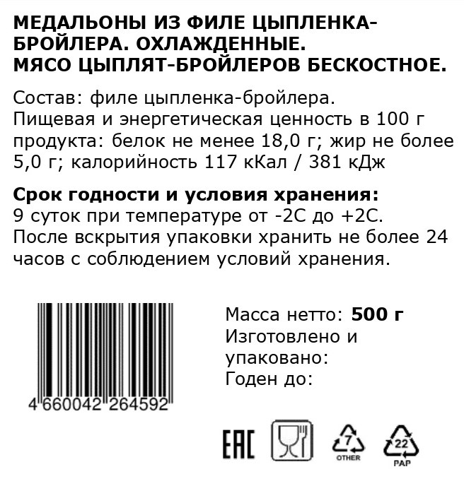 Медальоны из филе цыпленка-бройлера охлажденные мясо цыплят-бройлеров бескостное.