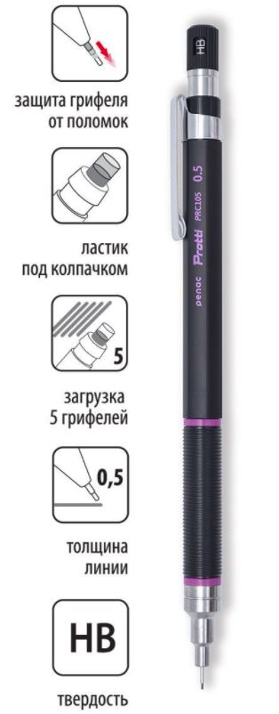 Penac Protti PRC 105 – один карандаш с двумя функциями для профессионального использования и ежедневного письма. Сочетает характеристики двух типов карандашей. Выдвижной металлический держатель длиной 4мм идеален для выполнения графических работ. Его конструкция позволяет работать с чертежными инструментами, в том числе неприлегающими к бумаге шаблонами и подходит для черчения, эскизов, графики. При этом, в отличие от стандартных профессиональных карандашей, Penac Protti PRC 105 снабжен амортизированным механизмом, который пружинит внутри пишущего узла, позволяя грифелю подстраиваться под силу нажима при письме и защищает его от поломок. Другая особенность Penac Protti PRC 105 - увеличенная в 4 раза длина безотрывного письма: при нажатии на пишущий узел выдвигается грифель длиной 1 мм, который пишет 5метров. После 4-хкратного нажатия и 20-ти метров письма нажмите один раз кнопку подачи грифеля для перезагрузки механизма, после чего вы вновь можете осуществлять подачу грифеля нажатием на пишущий узел. Индикатор твердости грифеля (HB, B, H, 2H, 3H & F) на кнопке – позволяет выставлять твердость грифелей, загруженных в корпус карандаша. Материал корпуса – пластик. Грифель 0,5мм, НВ. Под колпачком – ластик, не содержащий ПВХ, который быстро и чисто удаляет надписи. Грифели из композиции синтетических смол и графита отличаются высокой эластичностью, мягкостью письма и яркость линий. Суперпрочное полимерное покрытие уменьшает возможность случайных поломок грифелей при письме и обеспечивает их экономичное использование. В корп��с карандаша можно одновременно загрузить 5 грифелей, которые будут выходить один за другим. Penac – японский бренд пишущих инструментов и один из ведущих брендов механических карандашей в мире. Компании принадлежит ряд патентов на чернила для ручек, а также 80% патентов на конструктивные решения, используемые в механических карандашах. Все изделия Penac проходят 100% контроль качества – осуществляется проверка каждого пишущего инструмента. Цвет корпуса: черный/малиновый.