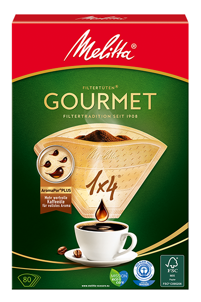 Фильтры для кофе Melitta Gourmet, 1 х 4, 80 шт. позволяют получить свежезаваренный кофе с восхитительным вкусом и ароматом. Изделия выполнены из тонкой бумаги с мелкопористой структурой Aromamax. Она обеспечивает продолжительную фильтрацию кофейных масел для максимального раскрытия оттенков вкуса. В такие фильтры можно засыпать кофе любого помола, даже порошкообразного, поскольку они обеспечивают высокое качество фильтрации кофейной гущи. Кроме того, бумажные фильтры эффективно задерживают соединения кофестола, природные алкалоиды и масла, которые способствуют повышению холестерина. Изделия упакованы в картонную коробку по 80 штук. Они представлены в формате 1х4, где вторая цифра означает количество чашек на одну заливку. Аксессуары предназначены для кофеварок Melitta.