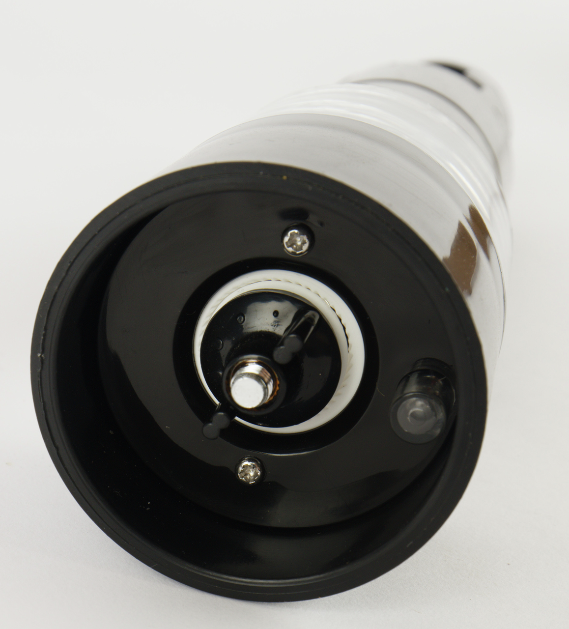 Мельница для измельчения перца в виде горошка, крупных кристаллов морской соли и других специй для их последующего добавления в блюда. Модель оснащена подсветкой и керамическими жерновами. Корпус выполнен из пластмассы, контейнер - из акрила. Активация осуществляется нажатием на кнопку.