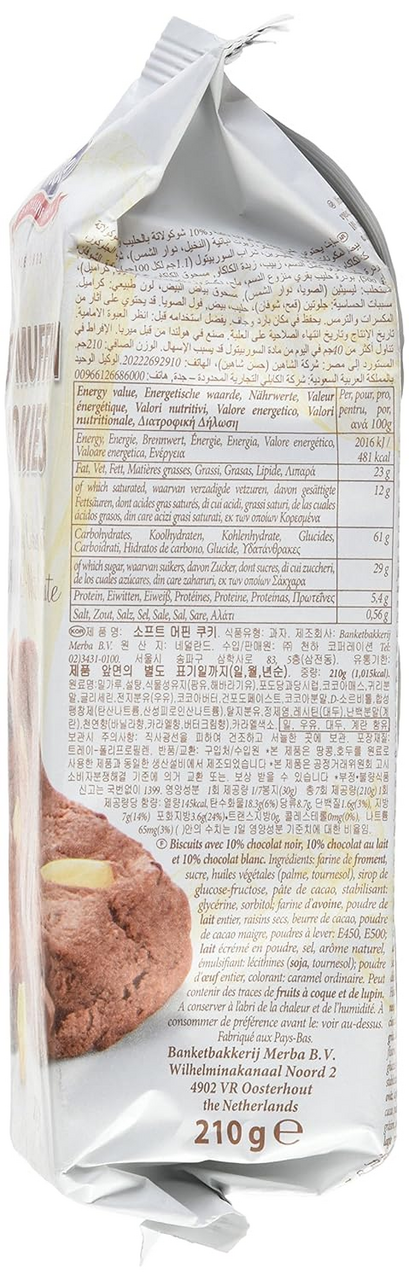 Печенье Merba Soft Muffin Cookies 210г – нежнейшее печенье, по текстуре напоминающее классические кексы. Мягкое и ароматное, оно буквально тает во рту, а кусочки белого, молочного и темного шоколада делают его вкус поистине волшебным. Кондитерские изделия не содержат ГМО и вредных искусственных добавок. Изысканное бельгийское лакомство рекомендуется подавать со свежезаваренным черным чаем, капучино или какао. Продукция марки Merba – это уникальное сочетание домашней рецептуры и ингредиентов высочайшего качества. Она производится в Нидерландах на современном предприятии, оснащенном передовым оборудованием. Вакуумная упаковка надежно сохраняет свежесть, вкусовые и ароматические свойства в течение всего срока годности.