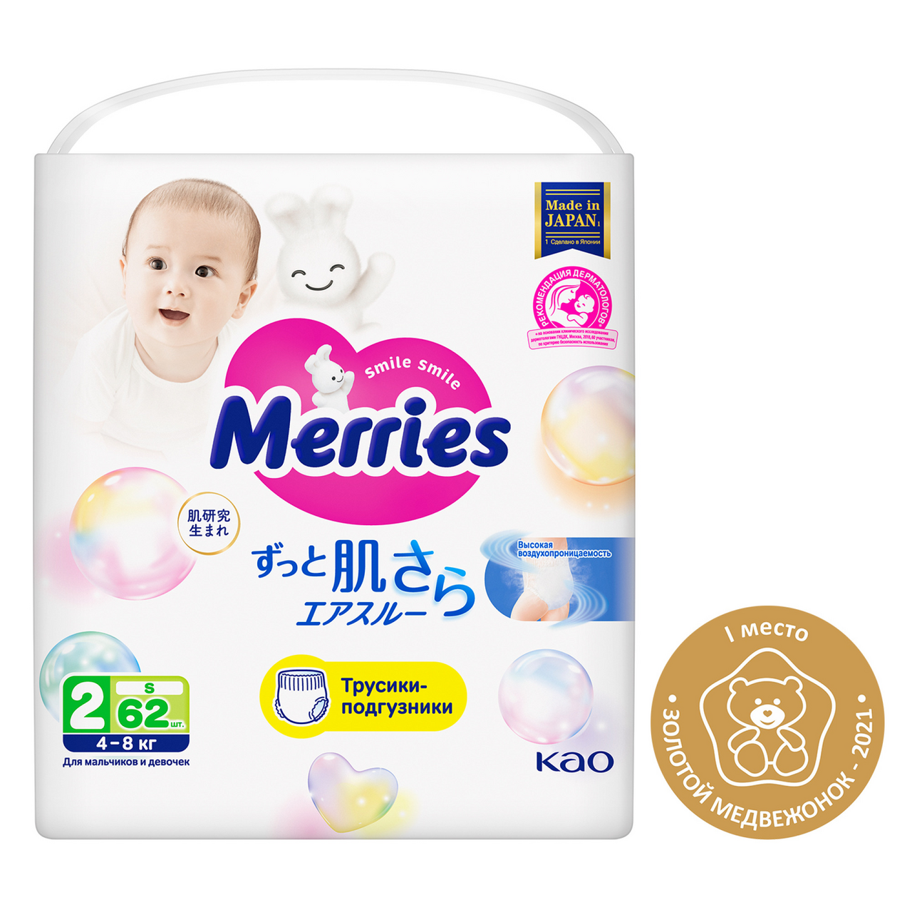 Подгузники-трусики Merries S 4-8кг, 62шт