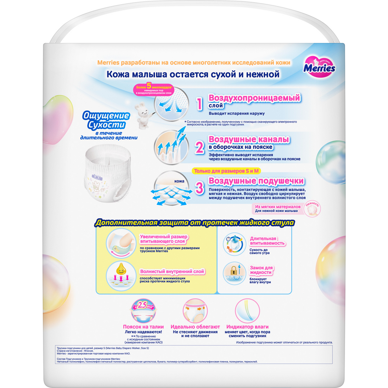 Для изготовления используются экологически безопасные материалы с отличными тактильными свойствами. Они проходят предварительную обработку горячим паром. Такая операция позволяет придать изделию невероятную мягкость и обеспечить стерильность. Между слоями целлюлозы расположены воздушные ячейки, которые способствуют естественной циркуляции воздуха между трусиками и нежной кожей малыша. Широкий эластичный пояс и двойные мягкие резинки в области ножек гарантируют идеальную посадку и защиту от протекания. Подгузник быстро снимать, для этого по бокам расположены швы, которые легки на разрыв. Одевая малыша, внимательно проследите за тем, чтобы не образовались складки внутреннего слоя вокруг бедер, которые могут вызвать дискомфорт.