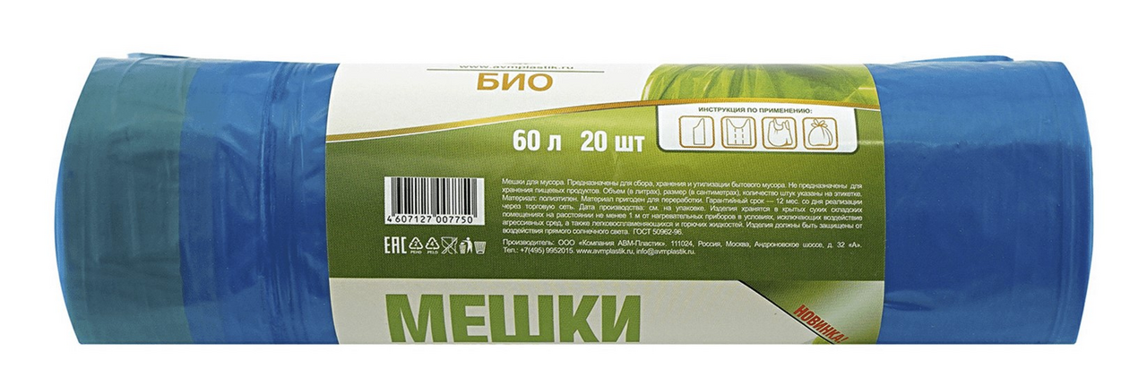 Мешки для мусора АВМ-пластик биоразлагаемые с завязками 60л 60х70см, 20 шт