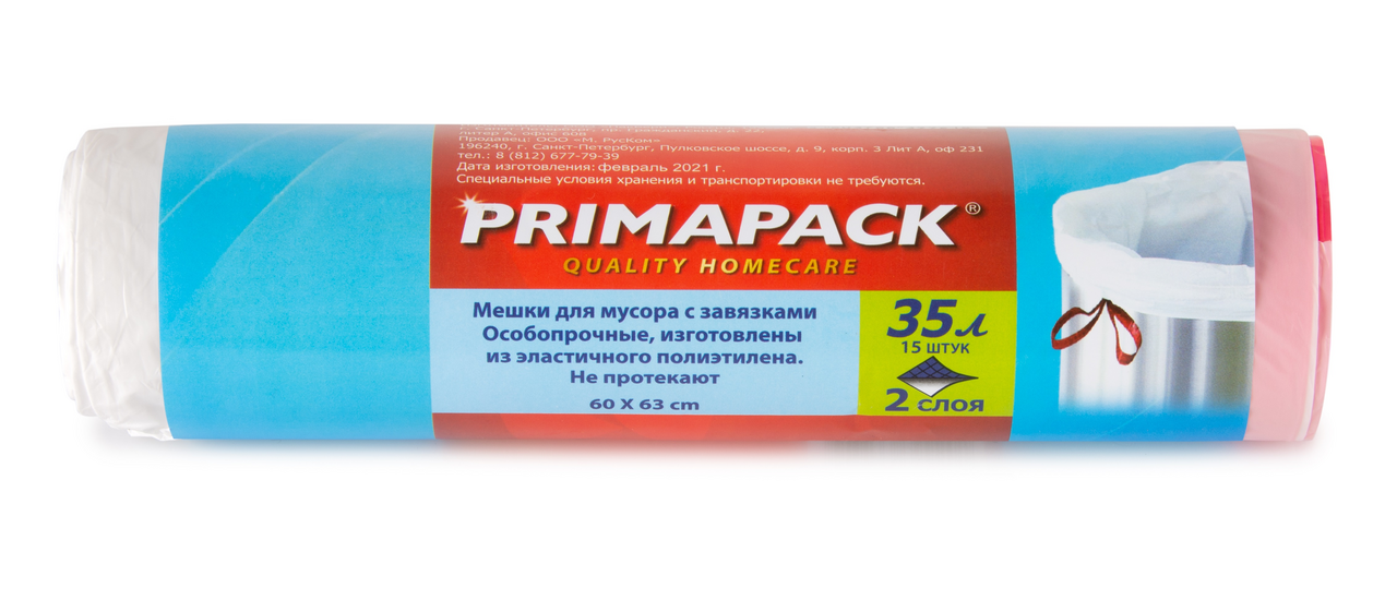 Мешки для мусора Primapack с завязками 60 х 63см, 35л х 15шт