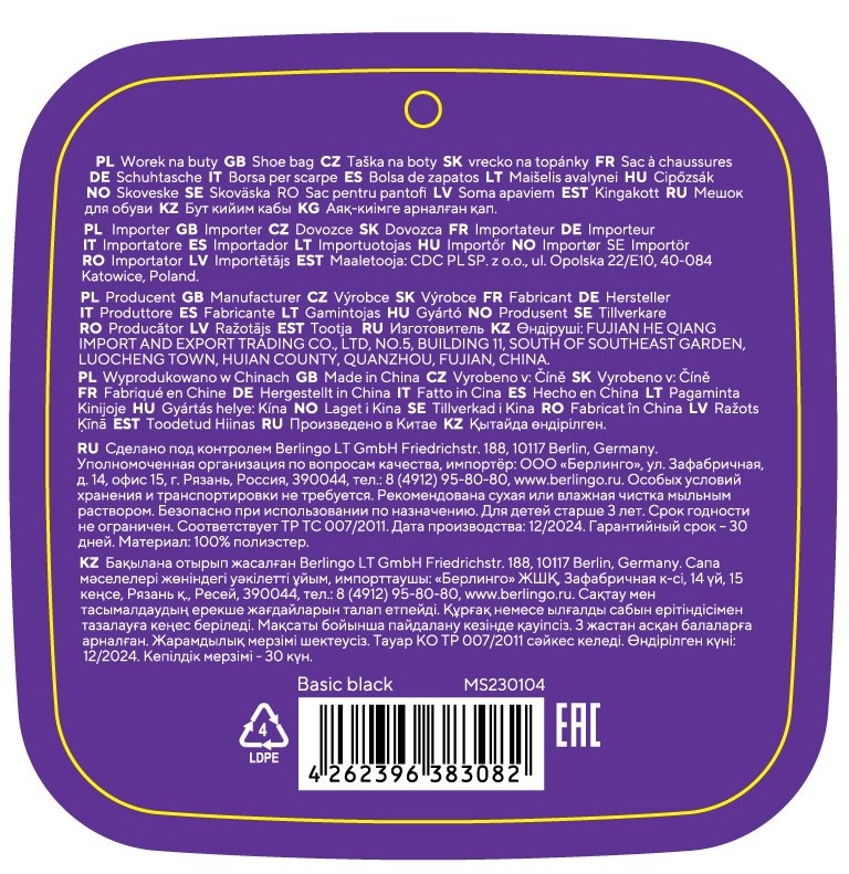 Мешок для обуви Berlingo Basic Black, 340 x 460мм