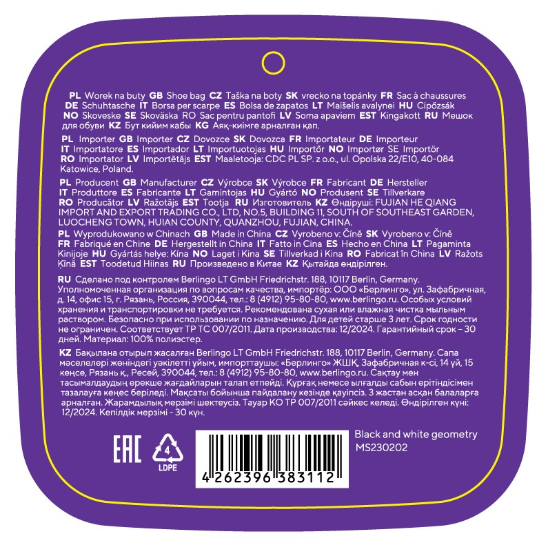Мешок для обуви Berlingo Black-White Geometry, 340 x 460мм