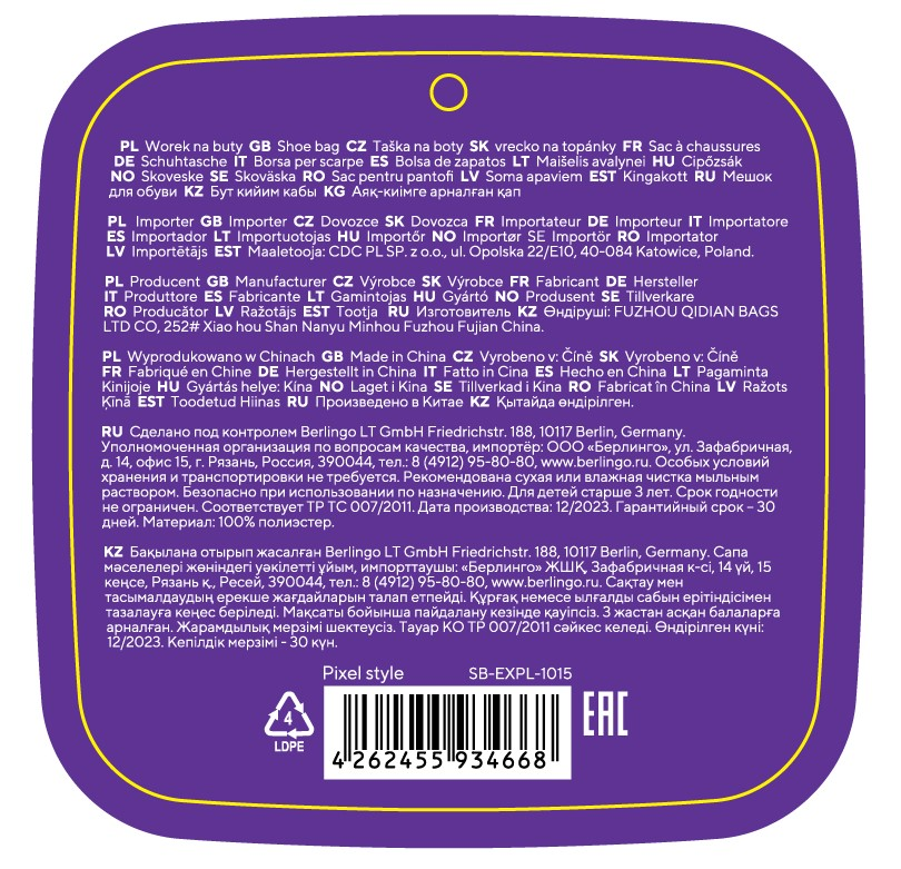 Мешок для обуви Berlingo Pixel Style, 340 x 460мм