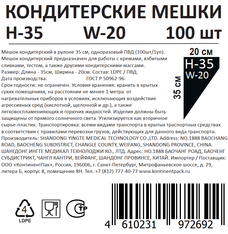 Мешок кондитерский Континентпак 90мк 100шт, 35 x 20см