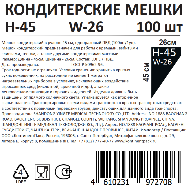 Мешок кондитерский Континентпак 90мк 100шт, 46 x 26см