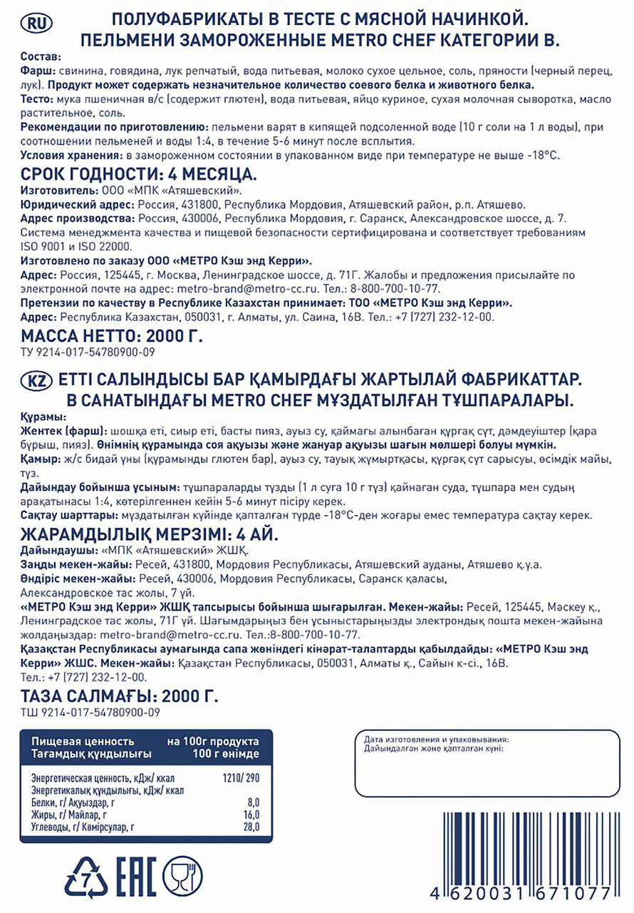 Пельмени METRO Chef, 2 кг — качественный полуфабрикат, рецептура которого разработана совместно с ведущими шеф-поварами по классическим русским традициям. Такие пельмени не отличишь от домашних — в их состав входит только свежее сочное мясо (свинина и говядина), репчатый лук, пряности и специи, а для приготовления теста используется пшеничная мука высшего сорта. Продукт поставляется в экономичных упаковках по 2 кг — такой пачки хватит на долгое время. С приготовлением этих пельменей справится даже тот, кто никогда не готовил — достаточно отварить их в подсоленной воде в течение 5-6 минут. Однако при желании можно попробовать другие варианты приготовления пельменей, например, их можно поджарить на растительном масле или запечь в духовке в горшочке с грибами, луком и сметаной. Эти блюда подойдут как для повседневного обеда или ужина, так и праздничного стола. В производстве продовольственных товаров METRO Chef использует только высококачественное сырье и современные технологии, благодаря чему их продукция пользуется спросом на современном рынке.
